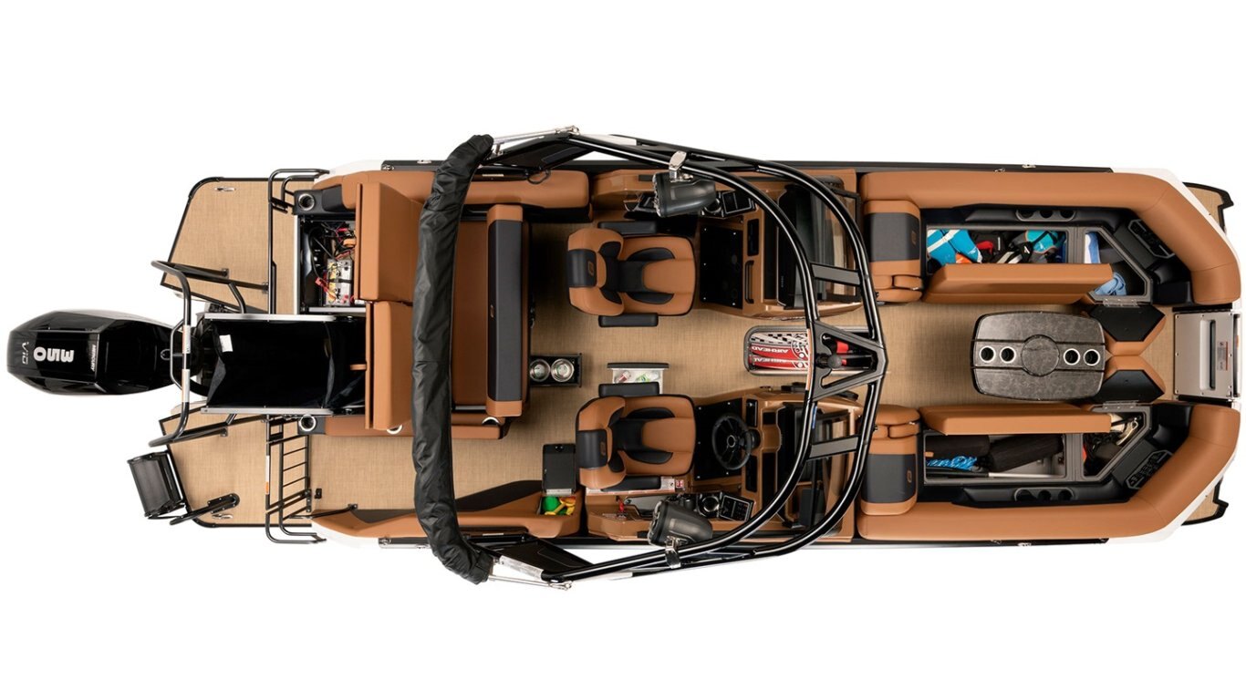 • Sport Edition including premium upholstery textured vinyl and LED lighting on floor, bimini top, pontoon logs, speakers, and fixed cup holders