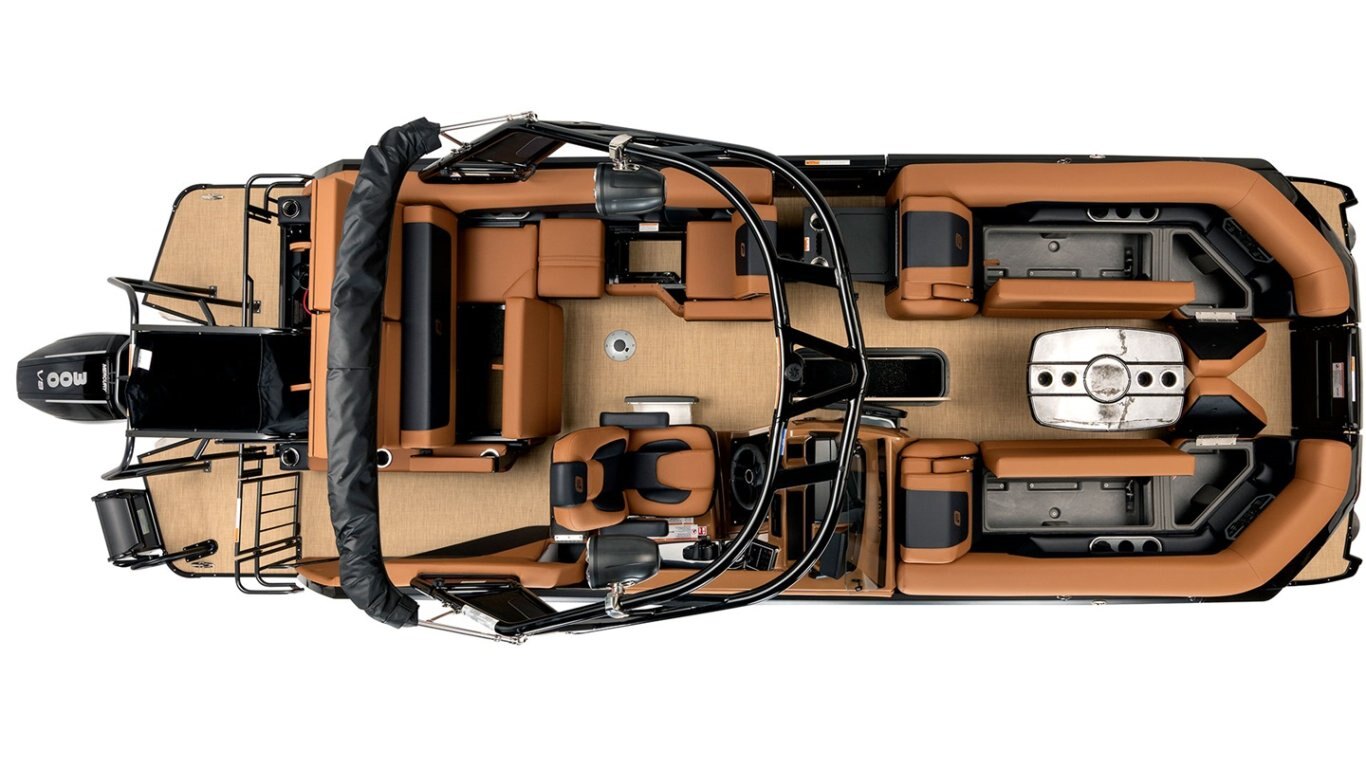 • Sport Edition including premium upholstery textured vinyl and LED lighting on floor, bimini top, pontoon logs, speakers, and fixed cup holders