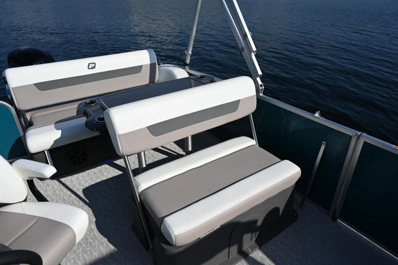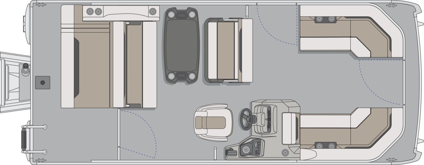 RL design including captain passenger seat, sundeck with 2-position adjustable backrest, large snack table, and storage under all seats